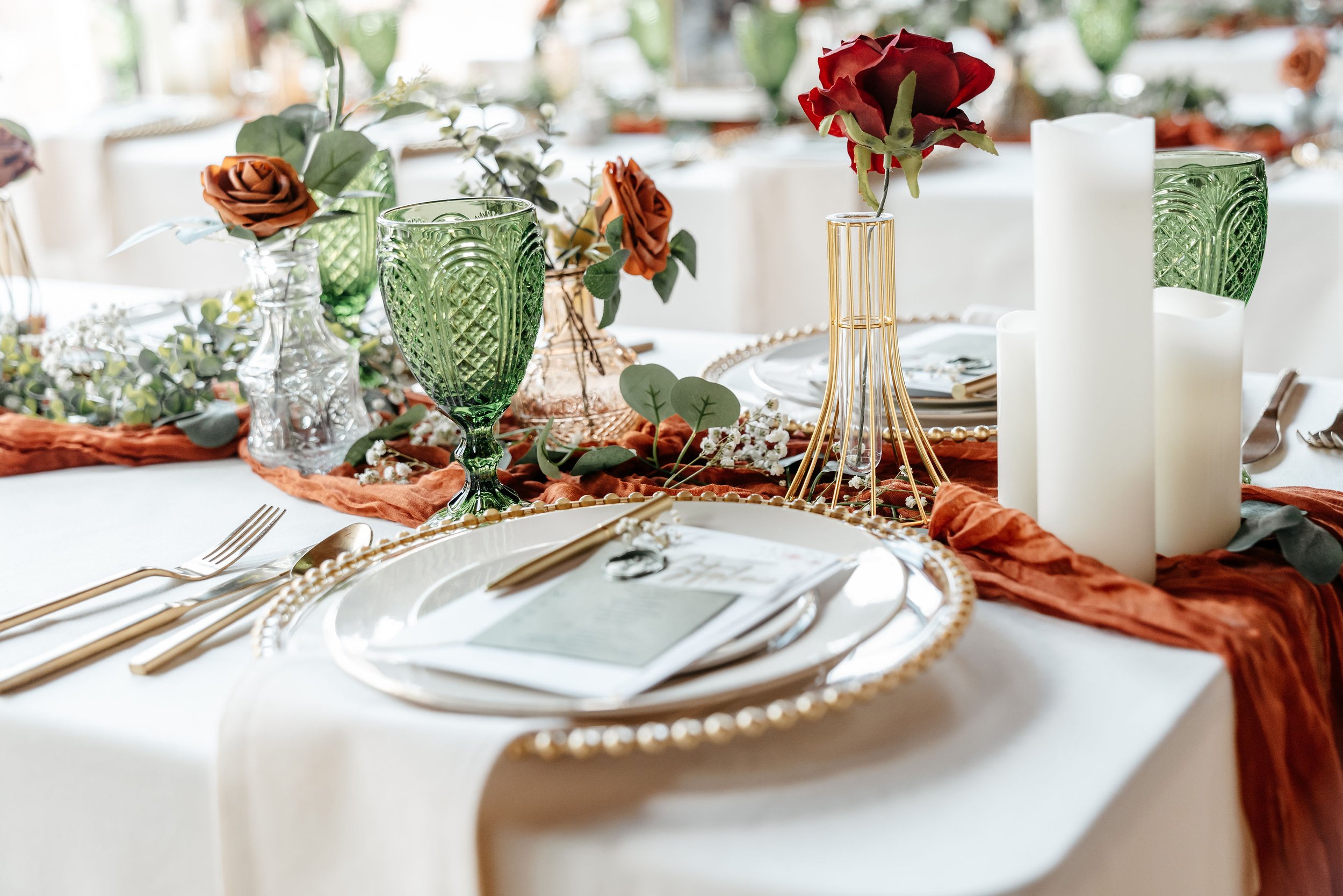 Table landscapes set the mood for your guest. From faux or fresh floral arrangements, menus, chargers, and candles we offer it all. Pricing varies depending on size, table count and color.