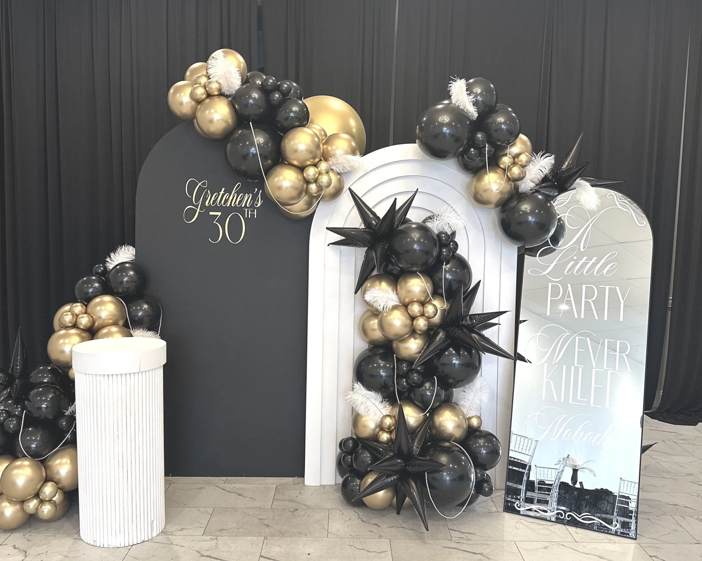 Our backdrops can be customized based on your event theme and needs. These backdrops are very versatile—they pair well with a balloon garland, flowers, or a neon sign. Inquire to learn more about add-ons and pricing.